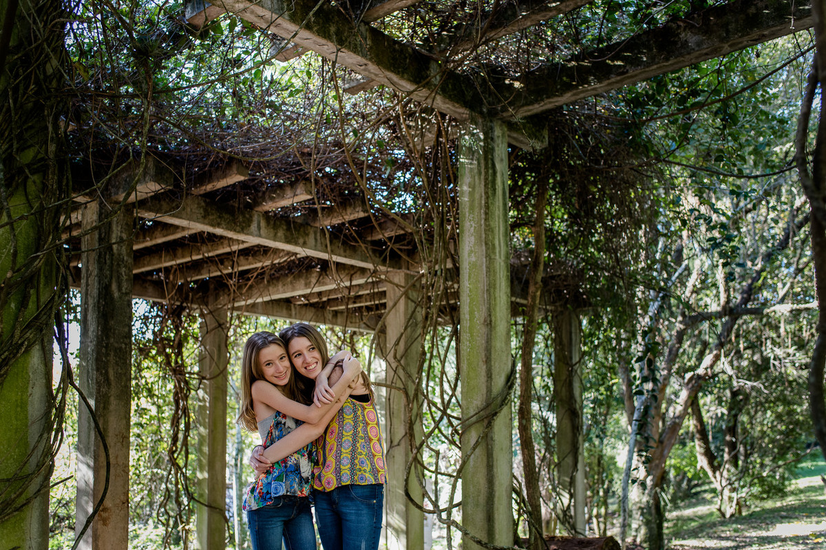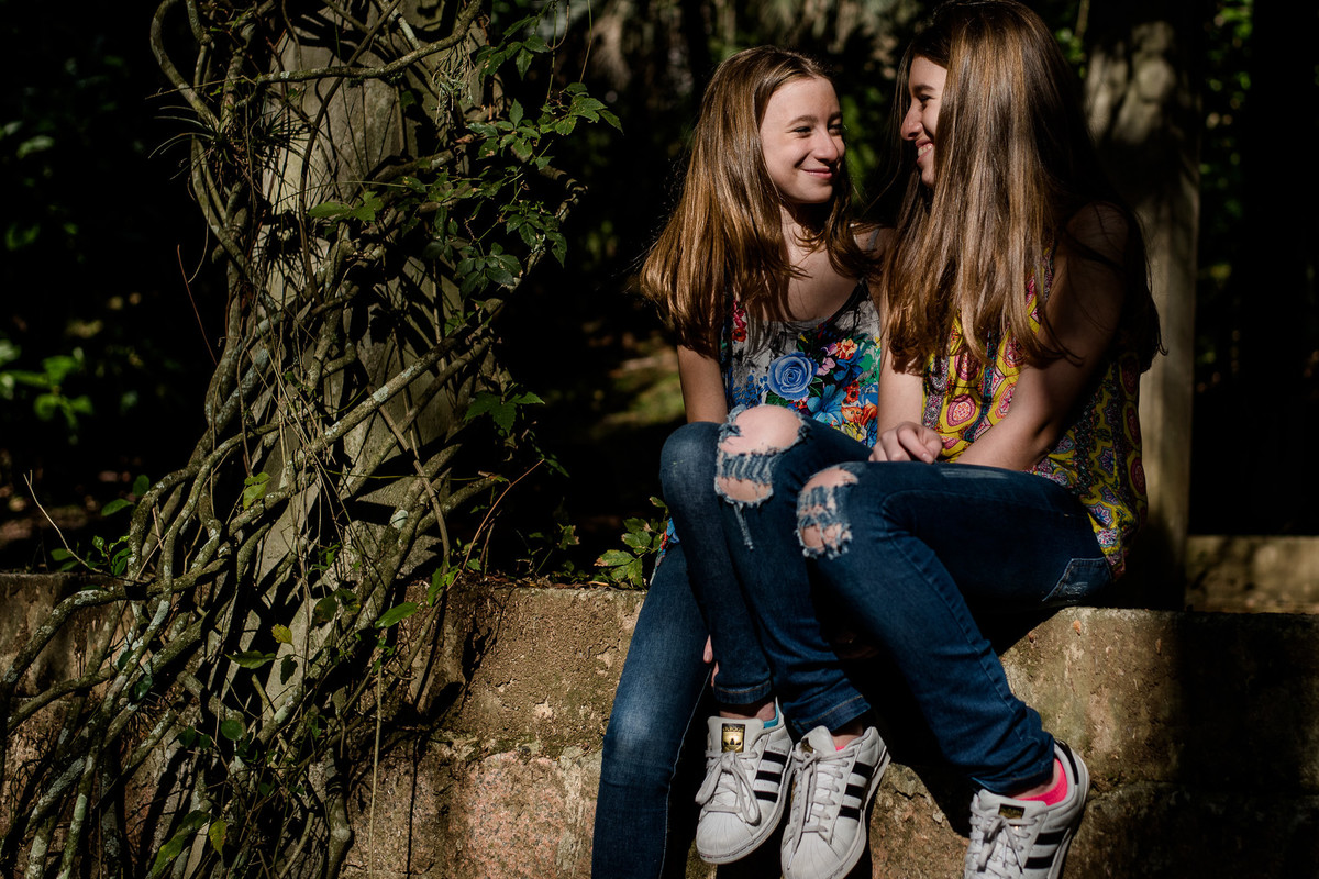 Mas sabe, o ensaio foi rolando, as risadas foram saindo e os momentos entre elas foram acontecendo como em uma tarde com os amigos em um parque. Eu estava ali me perguntando enquanto clicava: como pode duas irmãs gêmeas serem tão diferentes? Incrível e especial, gêmeas bi vitelinas, diferentes não só fisicamente, mas principalmente no jeitinho de ser, de se preparar para uma foto, uma mais tímida e introspectiva, a outra mais extrovertida, cada uma com sua personalidade. E é isso que torna as pessoas seres fascinantes, as diferenças.